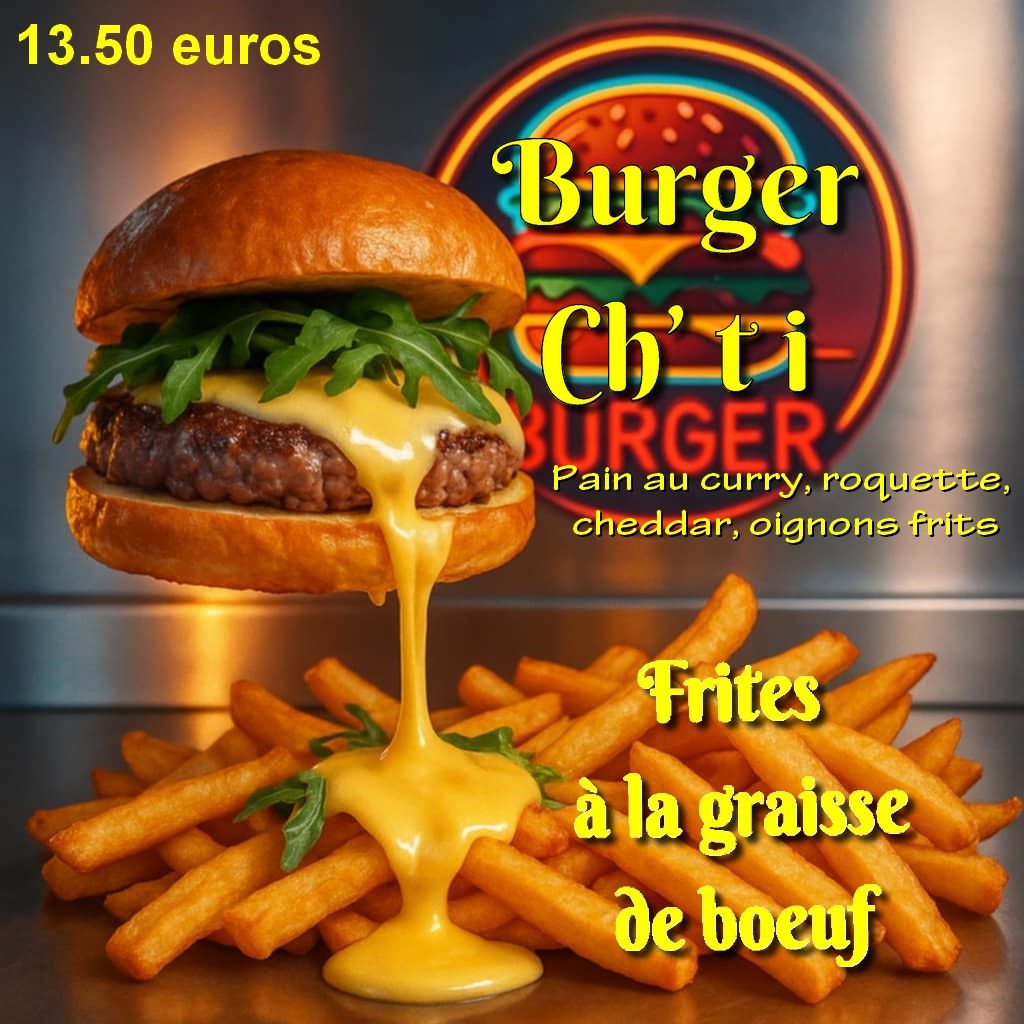 Steak, maroilles ou cheddar, tomates, roquette, bacon, oignons frits, sauce curry